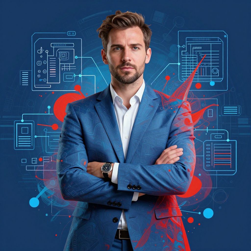 Portrait of a gestor in abstract style, blending human figure with digital elements like schematics and flowcharts, vibrant blues and reds, futuristic and creative interpretation, energetic and inspiring vibe
