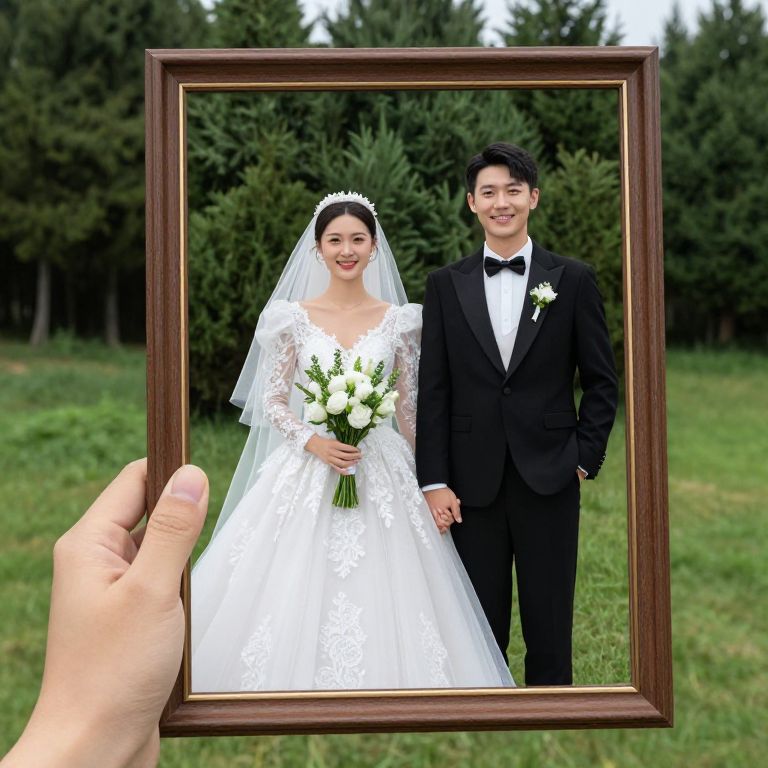 Photograph of an Asian bride in a white lace dress and veil, holding a bouquet, and groom in a black tuxedo, smiling, framed