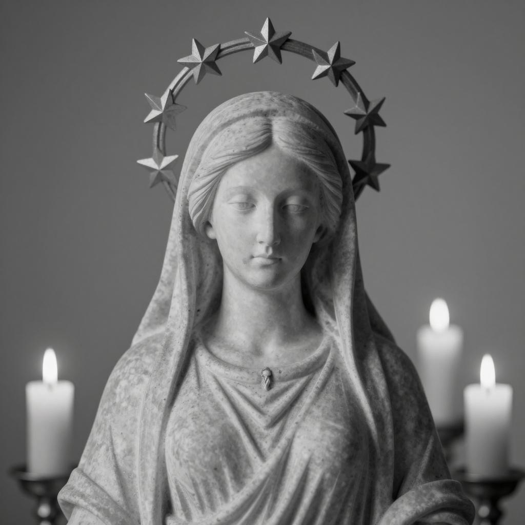 Black and white photograph of a religious ceremony. A woman in an ornate, patterned dress and headpiece kneels beside a decorated altar, holding a sword. Thirteen clergy members in tall white hats and patterned robes stand behind her. A priest in a similar outfit stands to the left. Candles and candlesticks line the background.