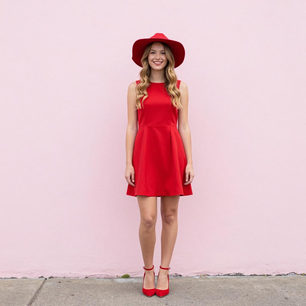 Red graduation dress, photograph of a young woman standing, full body, wearing a sleeveless red dress, red hat, and red high heels, wavy blonde hair, smiling, outdoors, against a pink wall, daytime, casual style, standing on pavement, minimal shadows, soft lighting, summer vibe