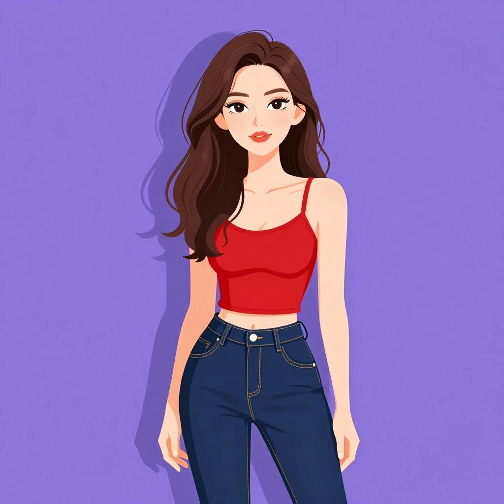Woman with pretty face and pretty hair. Woman, casual, solid red tank top with spaghetti straps, scoop neckline, form-fitting, hip-length, paired with dark blue skinny jeans, mid-rise waist, front and back pockets. --sref 1467