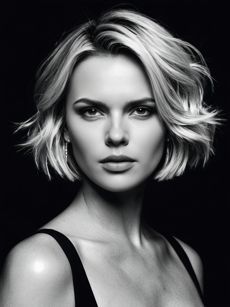 Woman with Charlize Theron Bob Hairstyle, photorealistic glamour fashion portrait