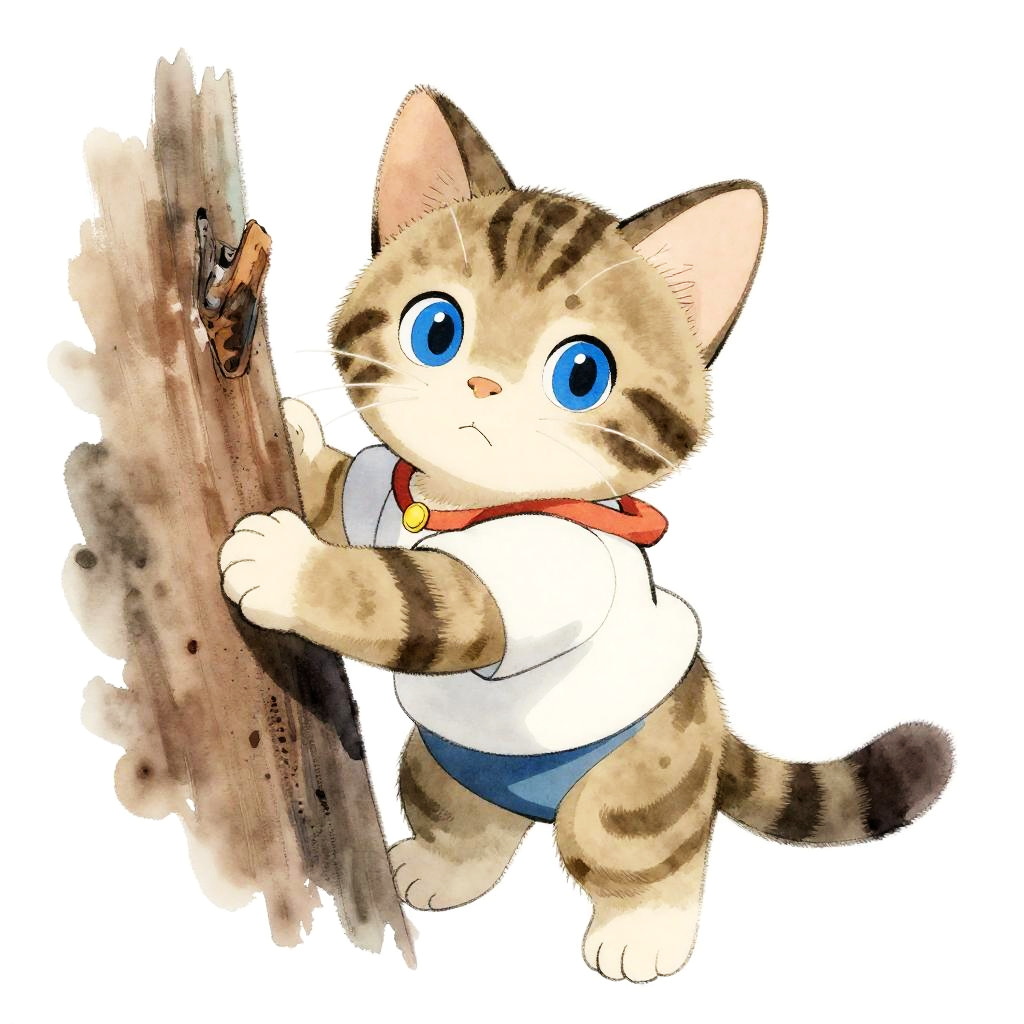 Ghibli-Style Tabby Kitten Climbing Tree