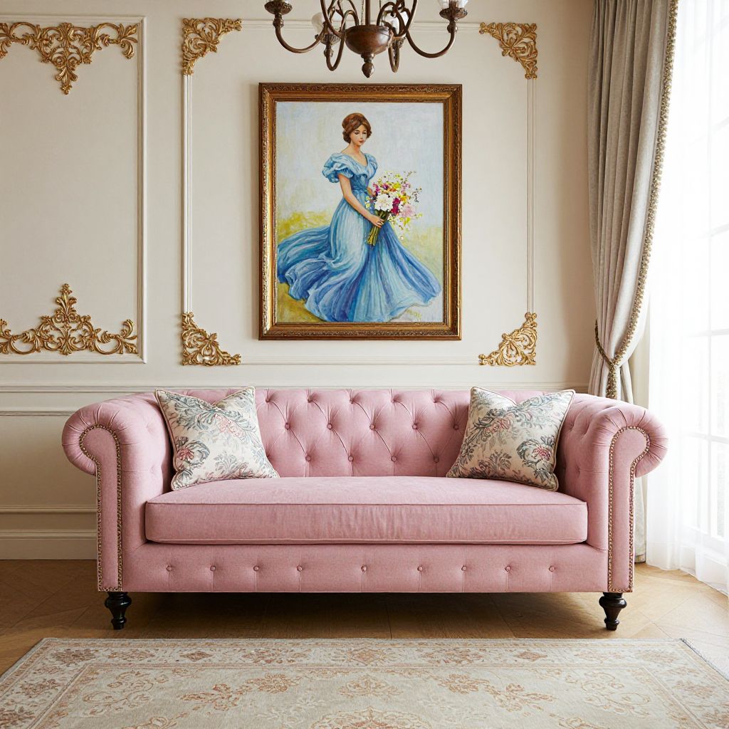 Elegant pink tufted chesterfield sofa adorned with two patterned throw pillows sits beneath a framed artwork of a woman in a flowing blue dress holding flowers, positioned against ornate gold-trimmed walls and complemented by a wooden chandelier above, all within a classic interior featuring a wooden floor, patterned rug, and large window with draped curtains.