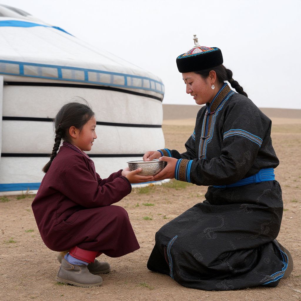 Woman and child in traditional dress (deel), silver bowl for milk greeting, near ger, Gobi desert, Bulgan, Omnogov, Mongolia, Central Asia, Asia