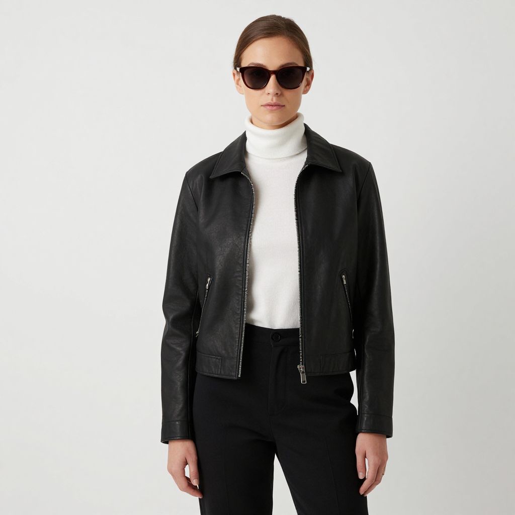 Photograph of a young woman with fair skin and brown hair pulled back, wearing black sunglasses, a black leather jacket with silver zippers, a white turtleneck, and black pants. The background is completely white, creating a stark contrast with her black outfit. She stands facing the camera with a neutral expression. The image has a minimalist, modern style, emphasizing the sharp lines and monochromatic color scheme. The lighting is even, highlighting the textures of the leather jacket and the smoothness of the turtleneck.