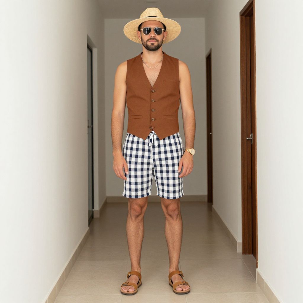 Man Summer Looks Costume, man standing in a hallway with a brown vest and tan sandals