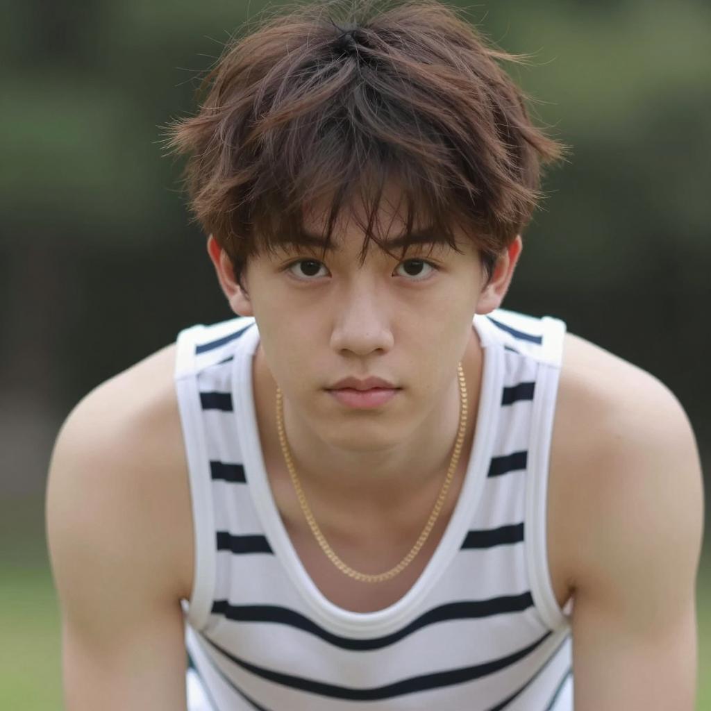 Young man with short, tousled brown hair, wearing a white tank top with black stripes and a gold chain necklace. He leans forward, looking directly at the camera with a slight, neutral expression. Background is blurred greenery. Close-up photograph.