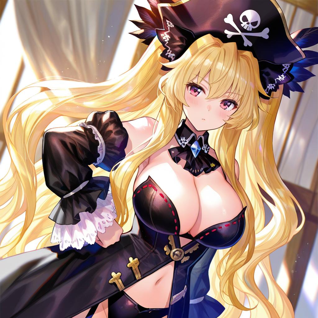 Digital illustration of an anime-style female pirate character with very long blonde hair and red eyes, wearing a black pirate hat adorned with a skull and crossbones. She has large breasts, visible cleavage, and a black outfit with gold cross decorations and frilled sleeves. The character poses with a confident stance in a softly lit indoor setting.