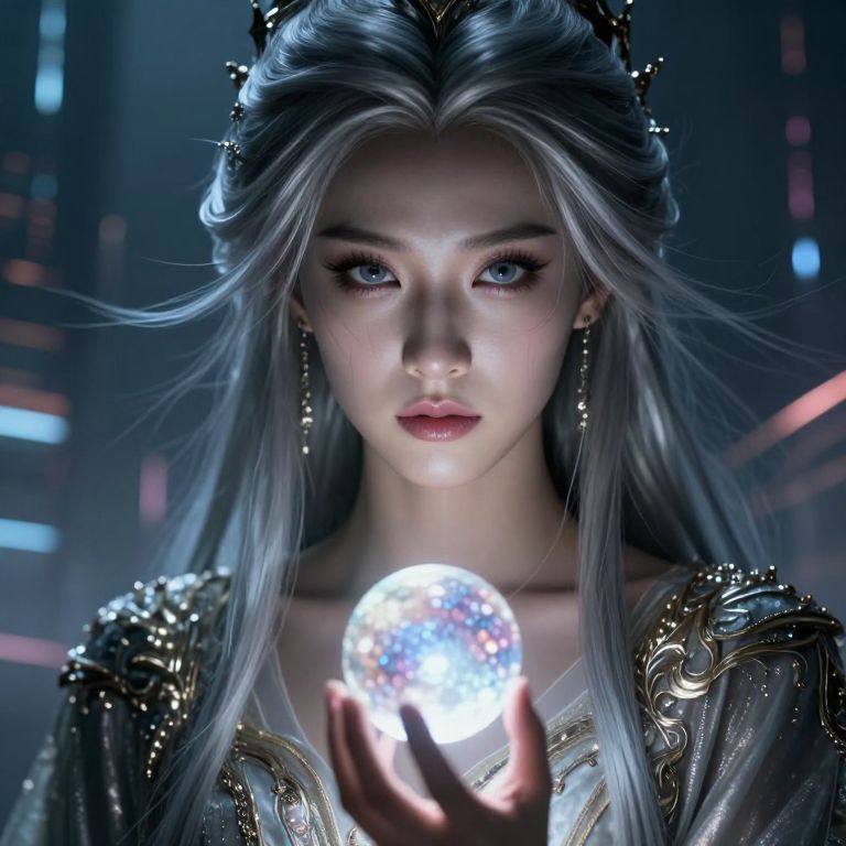 Craft an ultra-realistic high-definition digital portrait of a mystical oracle adorned in shimmering fabric embellished with intricate metallic embroidery. Her intense gaze, framed by long flowing hair streaked with silver, exudes an otherworldly aura. The ethereal cityscape behind her blends cyberpunk and fantasy elements. A soft spotlight illuminates her face from below, casting dramatic shadows that accentuate the fine lines on her skin. Her eyes, holding secrets of the universe, contemplate a shimmering orb levitating in her hand.