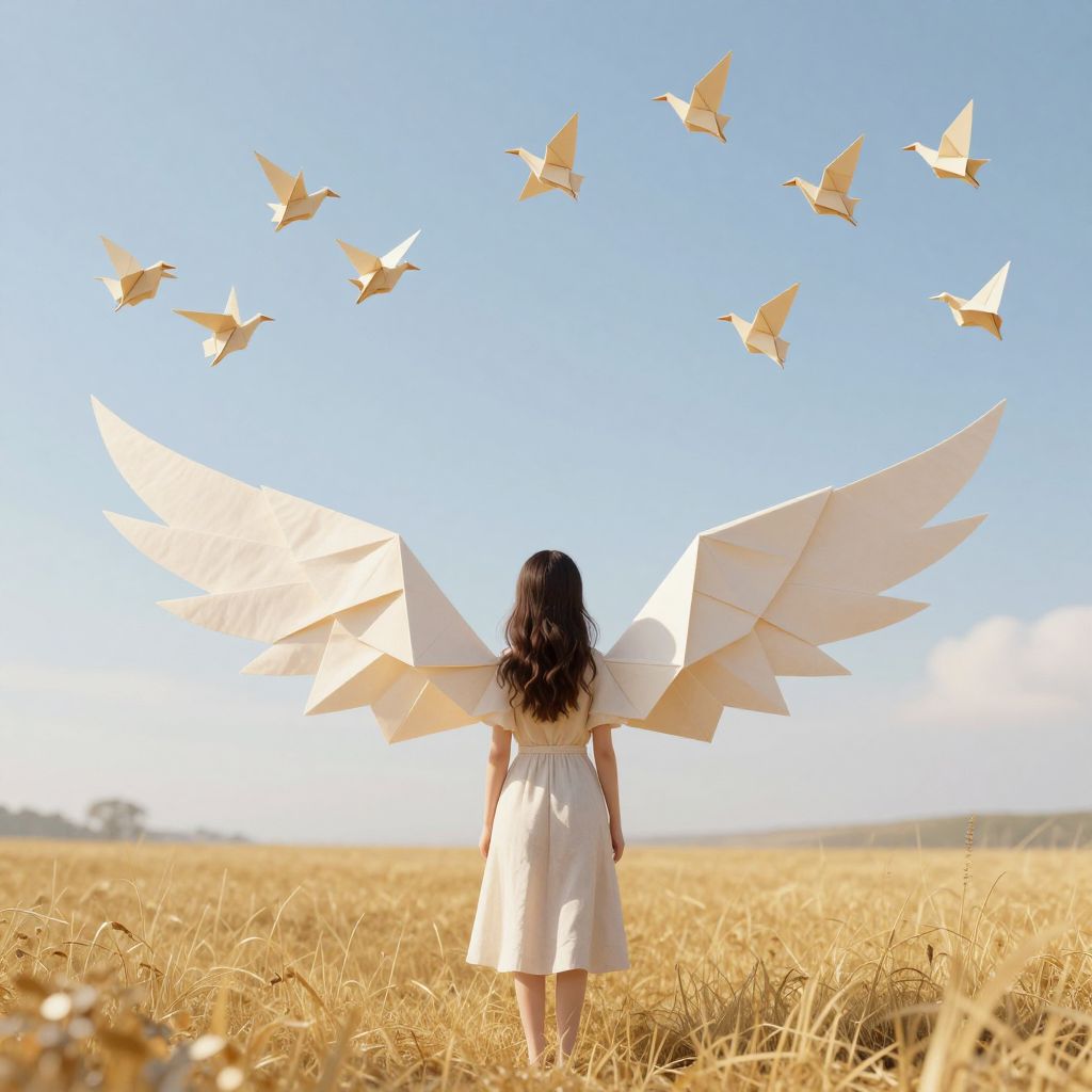 A serene 3D-rendered scene depicts a woman adorned with ethereal origami wings, standing amidst a golden meadow as she gazes upward at a flock of intricately crafted paper cranes flying in perfect geometric formation, evoking a dreamlike, high-definition blend of fantasy and realism.