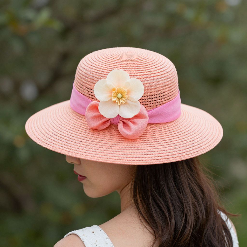 Coral fascinator hat adorned with a cream flower and pink accents elegantly perched atop a woman's head, complementing her vibrant summer ensemble.