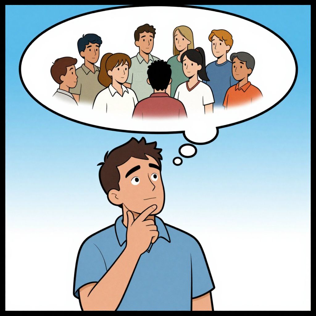 Advertising Poster a man thinks with a thought bubble above his head about other people , (he imagines people in the thought bubble). in the style of a 2000s cartoon,