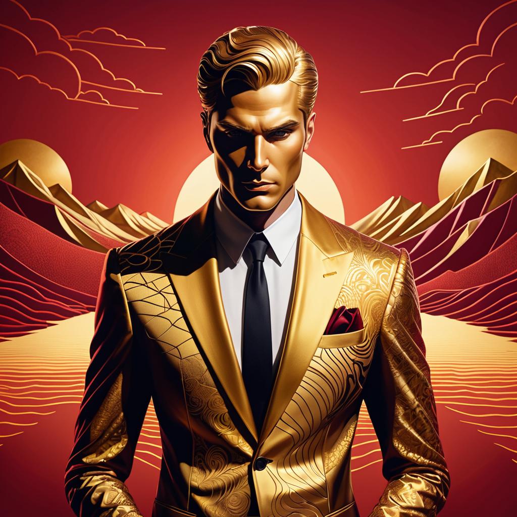 Stylized digital art featuring a confident man wearing a detailed gold suit with intricate patterns, a red tie, and a matching pocket square. The background showcases an abstract, vibrant sunset over a surreal mountainous landscape with flowing red hills and a reflective body of water.