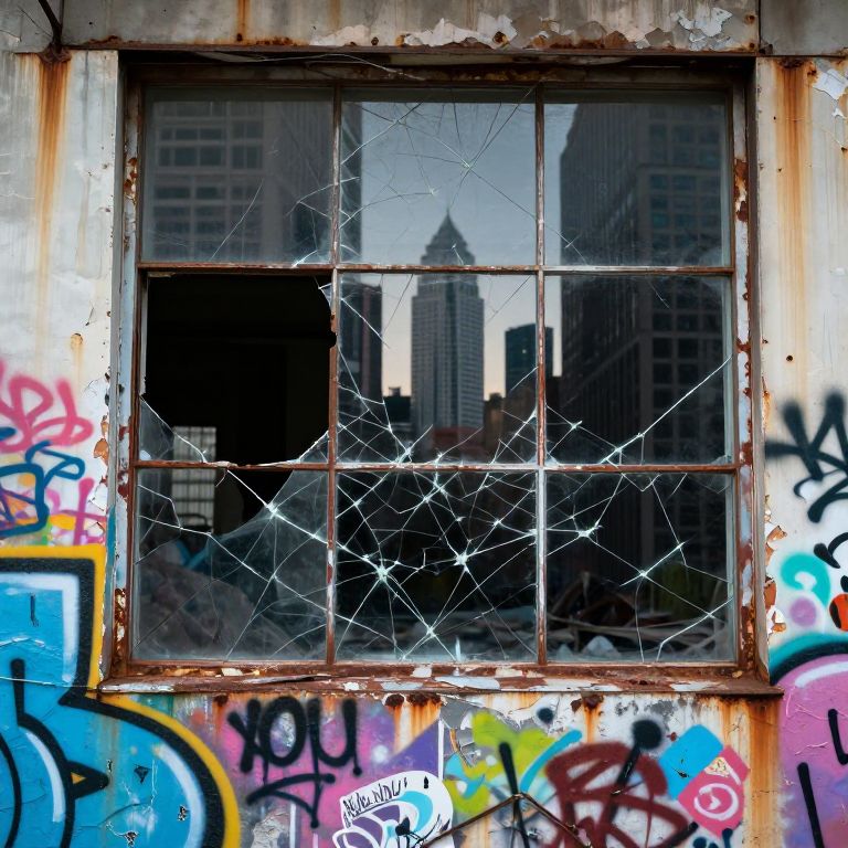 Behind the cracked glass window of an abandoned urban building, shadowy silhouettes of towering skyscrapers loom in the background as graffiti art spreads vibrant colors amidst peeling paint and rusted metal, portraying urban decay and resilience.