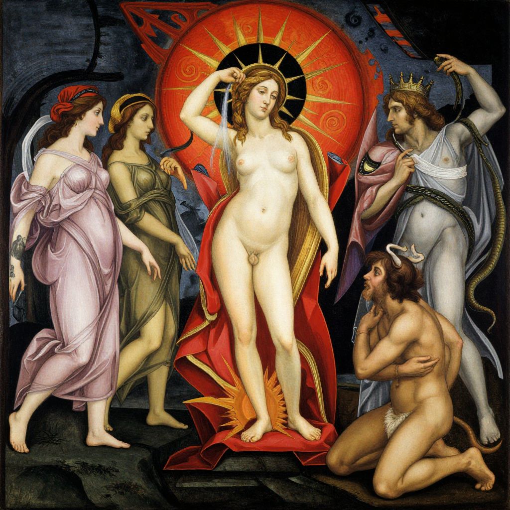 The image depicts a vibrant and dynamic scene inspired by Sandro Botticelli's \"The Birth of Venus.\" Central to the composition is a nude female figure, adorned with a sunburst halo, standing on a red cloth with a sunburst pattern. To her left, two women in flowing robes, one with a red headpiece, appear to be in motion, while to her right, a man with a crown and a snake-like tail seems to be in a state of transformation. In the background, a fiery red sphere with swirling patterns and a black sphere within it adds a sense of chaos and hellish energy. A satyr-like figure with horns and a tail kneels in the foreground, observing the scene. The overall composition is rich with contrasting elements, from the serene nude figure to the chaotic background, creating a striking visual narrative.