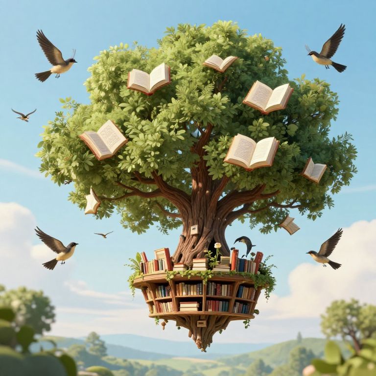 Digital illustration of a floating tree with books and open books on branches, surrounded by flying birds, against a bright blue sky.