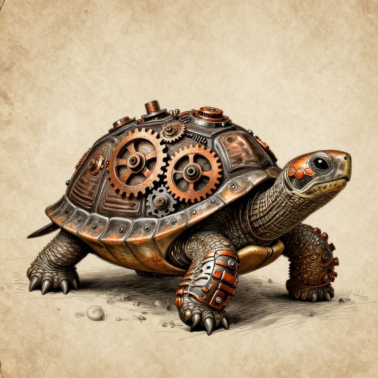 Digital illustration of a steampunk turtle with gears and cogs on its shell, detailed textures, and a brownish-yellow background.