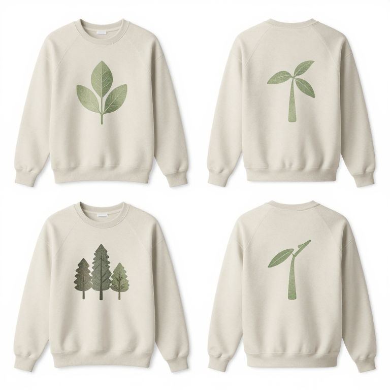 Photograph of four white, long-sleeve, crew-neck sweatshirts displayed against a plain white background. Each sweatshirt features a distinct, green leaf or plant design in the center. Top left: three-leaf plant. Top right: two-leaf plant. Bottom left: two coniferous trees. Bottom right: single leaf. The plant designs are simplistic, with a slightly textured, leaf-like pattern. The sweatshirts have a soft, slightly ribbed texture, and the designs are evenly centered on the front. The overall style is minimalist and eco-friendly.