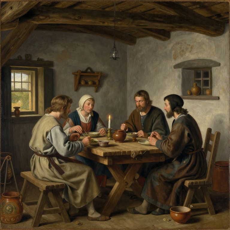 Medieval peasant painting showing a humble farmhouse interior, a family gathered around a wooden table having a meal, simple furnishings, candles and pottery, soft warm lighting, an intimate glimpse into medieval rural life with muted color palette