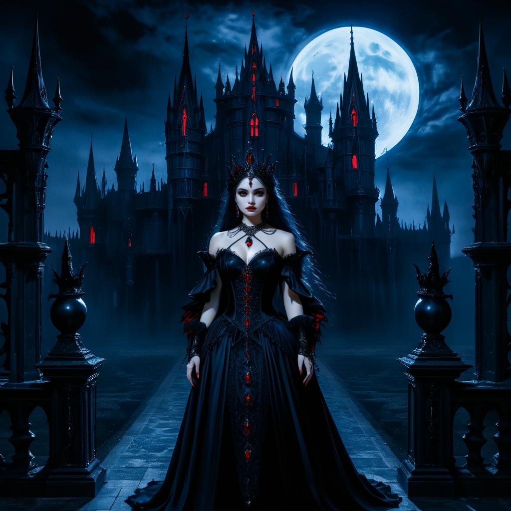A gothic painting of a dark sorceress with piercing red eyes wearing an ornate black dress and matching black crown adorned with red gems. She stands in front of a dark, ominous castle under bright full moonlight with blue hues, creating a mysterious and eerie atmosphere.