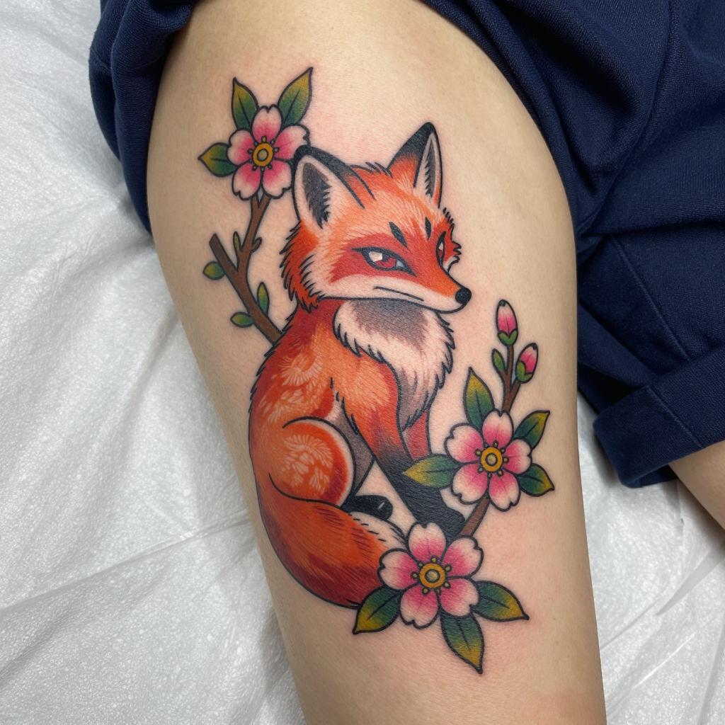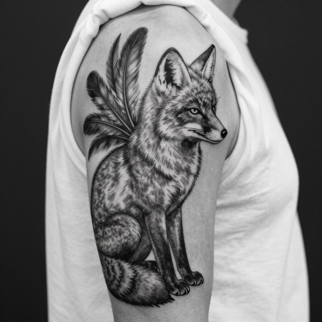 Tattoo of a fierce, orange fox with multiple flowing tails, biting a stick with green and blue feathers. Fox has a white chest and black, swirling cloud background. Tattooed on human upper arm. Fox's mouth is open, showing sharp teeth. Fox's eyes are fierce. Tattoo style is colorful with bold lines and shading.