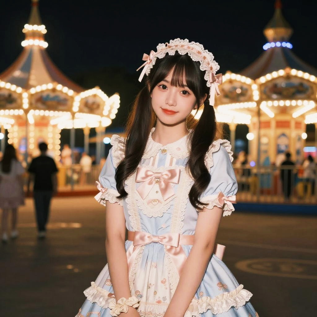Young Asian woman wearing a light pink fancy dress with red bows and lace trim paired with a Minnie Mouse ears headband with a red polka dot bow, standing outdoors in front of a tree and greenery.