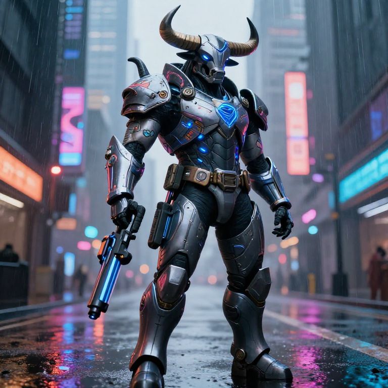 Humanoid bull warrior in a futuristic cyberpunk city, metallic horns, neon-lit tattoos, sleek armored suit with glowing blue accents, holding a high-tech weapon, rain-soaked streets, vibrant reflections and detailed cityscape background