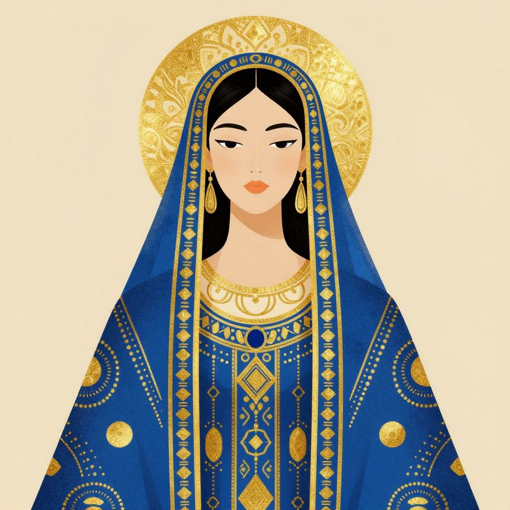 This stunning illustration features a woman adorned with intricate geometric patterns and rich colors, showcasing a blend of modern and ancient artistic styles. The use of vibrant blues and golds emphasizes her regal aura, creating a captivating focal point that draws the viewer into the imagery. The artwork masterfully combines elements of minimalism and detailed ornamentation.