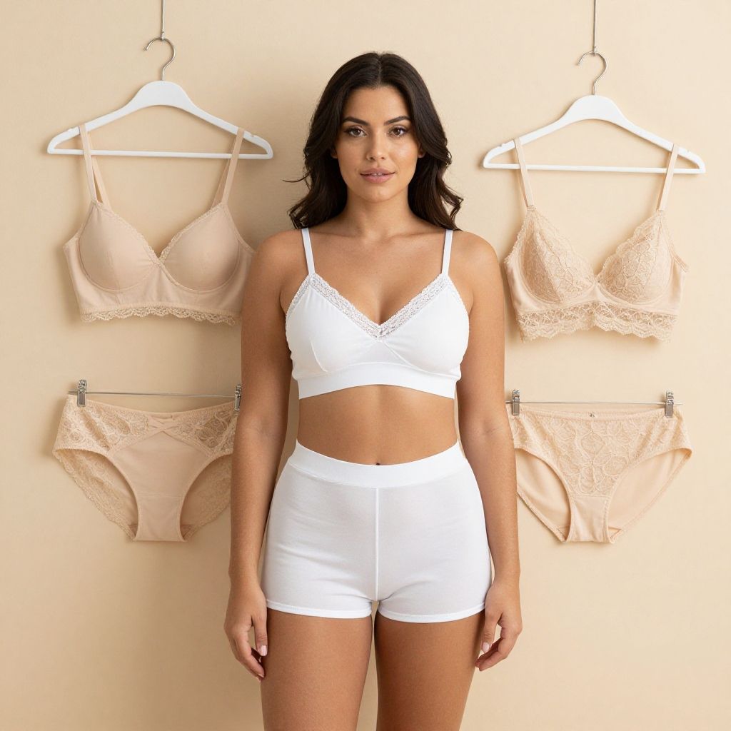 Photograph of a fair-skinned woman with curly brown hair, wearing white lace lingerie with a high-waisted panty and bra, against a