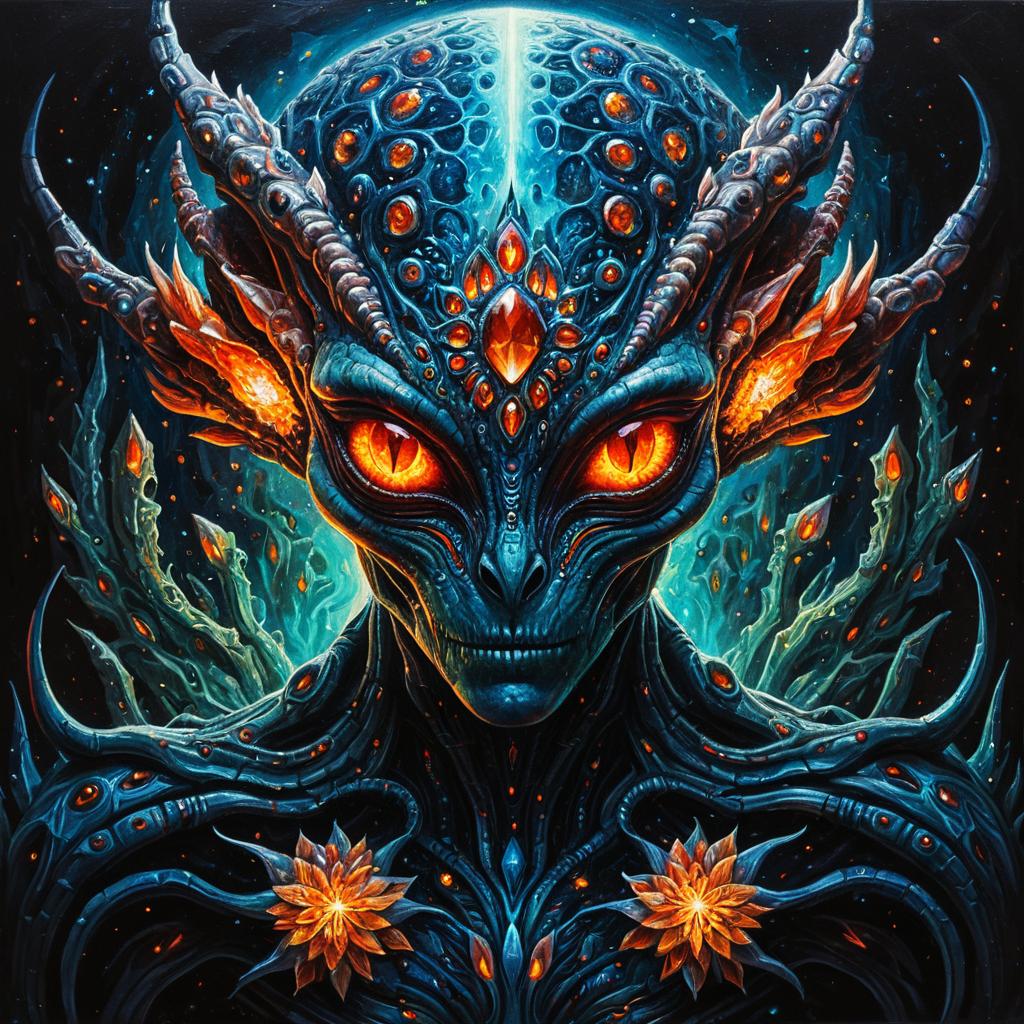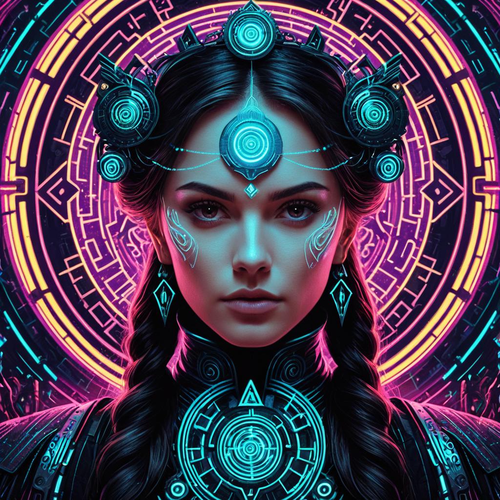 Beautiful hybrid android with neon circuit patterns glowing softly beneath translucent skin, oil painting, detailed fiery eyes, ethereal glow, dark and mysterious, high quality, vibrant colors, surreal, haunting, intricate floral details, intense gaze, mystical atmosphere