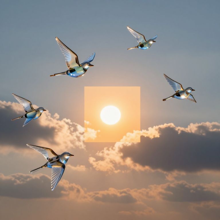 Glass birds with mirrored feathers reflect different timelines in every blink, flying in reverse while a square sun sets in triangle-shaped clouds.
