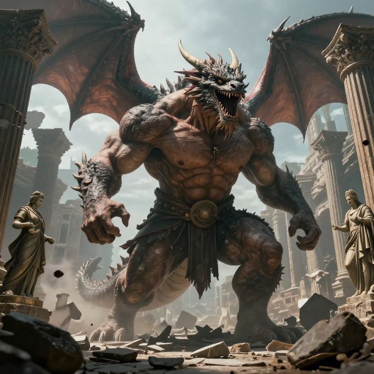 Muscular giant battling a colossal dragon in an ancient ruined city, surrounded by broken columns and shattered statues, muscles tense and veins popping, fierce expression, cinematic lighting with dramatic shadows, fantasy art style.