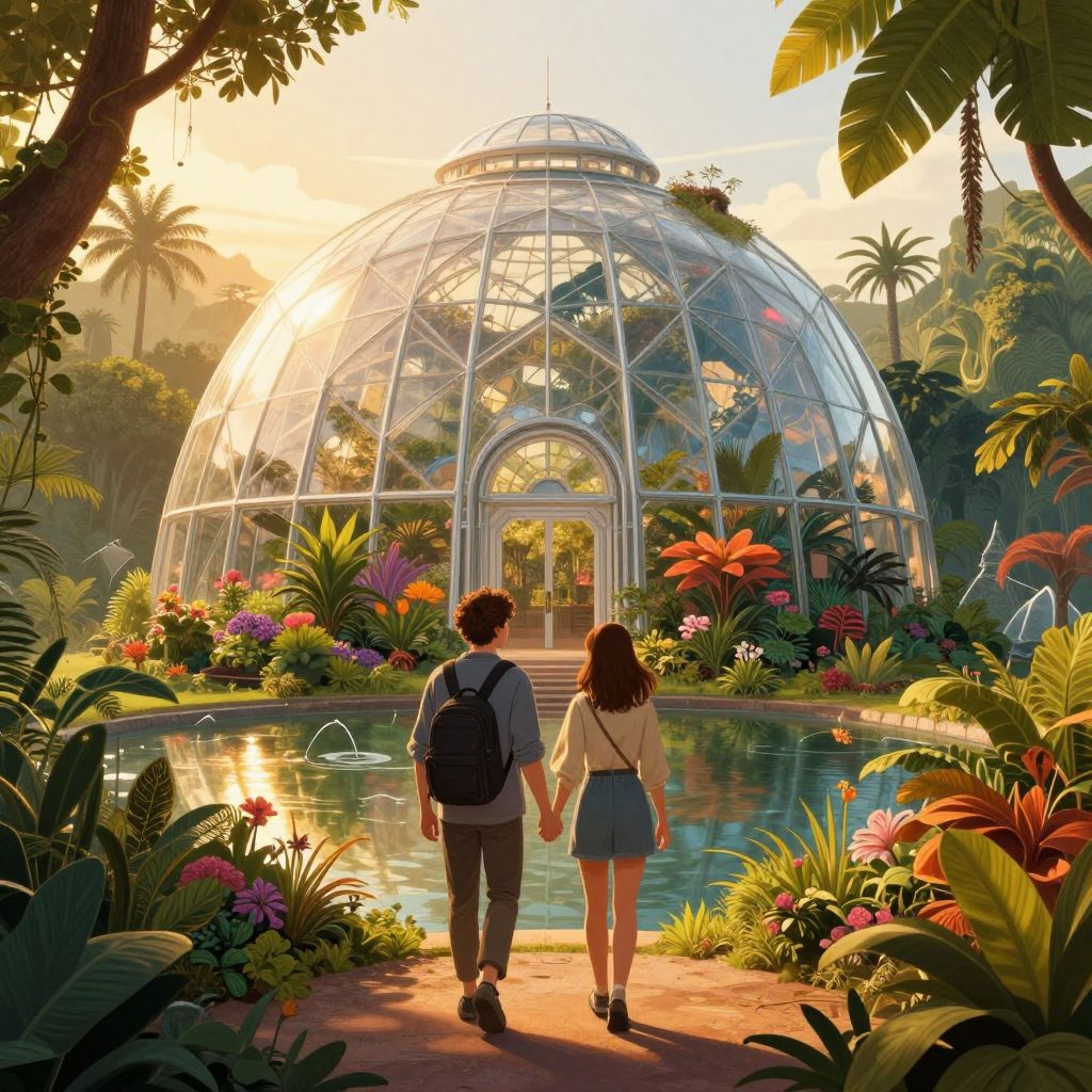 Digital illustration of a sunlit glass dome greenhouse, with a couple holding hands, walking along a reflective pond surrounded by vibrant tropical plants and flowers.