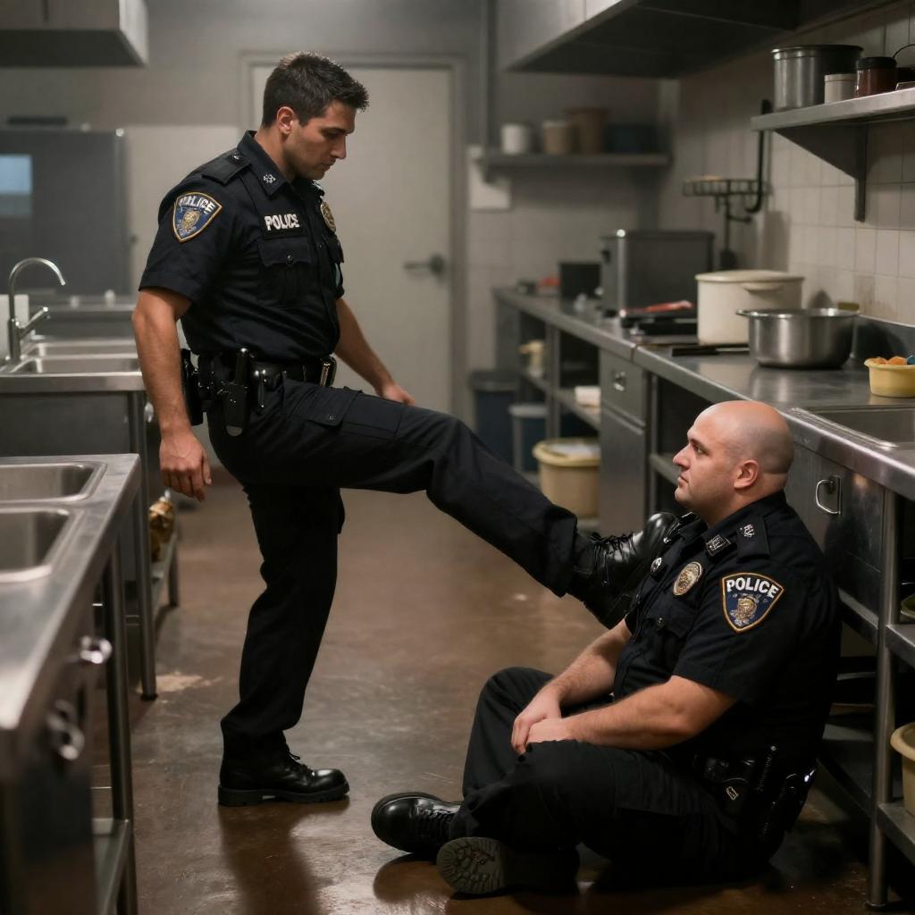 Photograph of two male police officers in a dimly lit, industrial kitchen. One officer, with dark hair and a medium build, kicks the other, who has a bald head and a stocky build, who is seated on the floor. Both wear black uniforms with "POLICE" on the back. The kitchen has metal countertops, sinks, and a cluttered background.