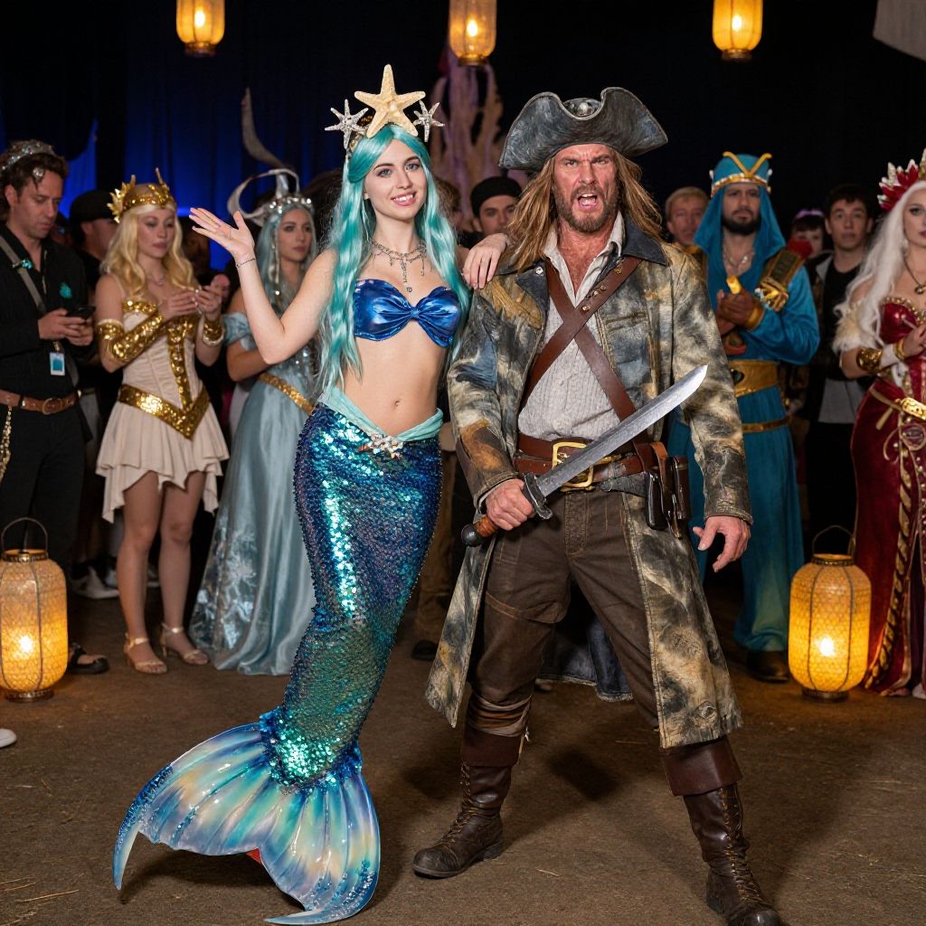 Captain and mermaid costume, fantasy cosplay event scene with a fierce captain wearing a weathered coat and wielding a cutlass, paired with a mermaid clad in a sparkling sequined tail and starfish crown, surrounded by a crowd in elaborate sea-themed costumes and glowing lanterns.