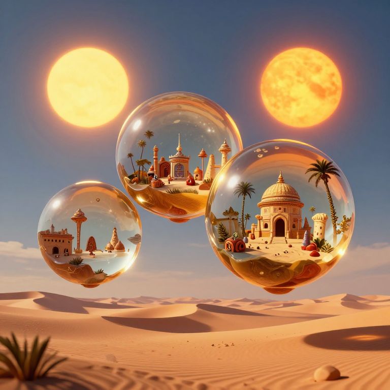 Photograph of three transparent bubbles floating over a desert, each reflecting detailed miniature mosques with domes, palms, and suns in the vibrant blue sky