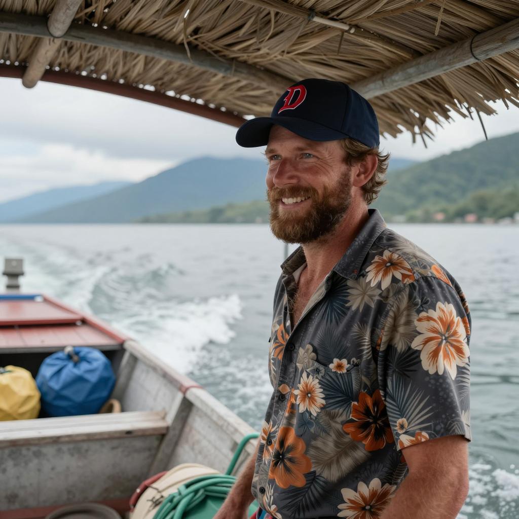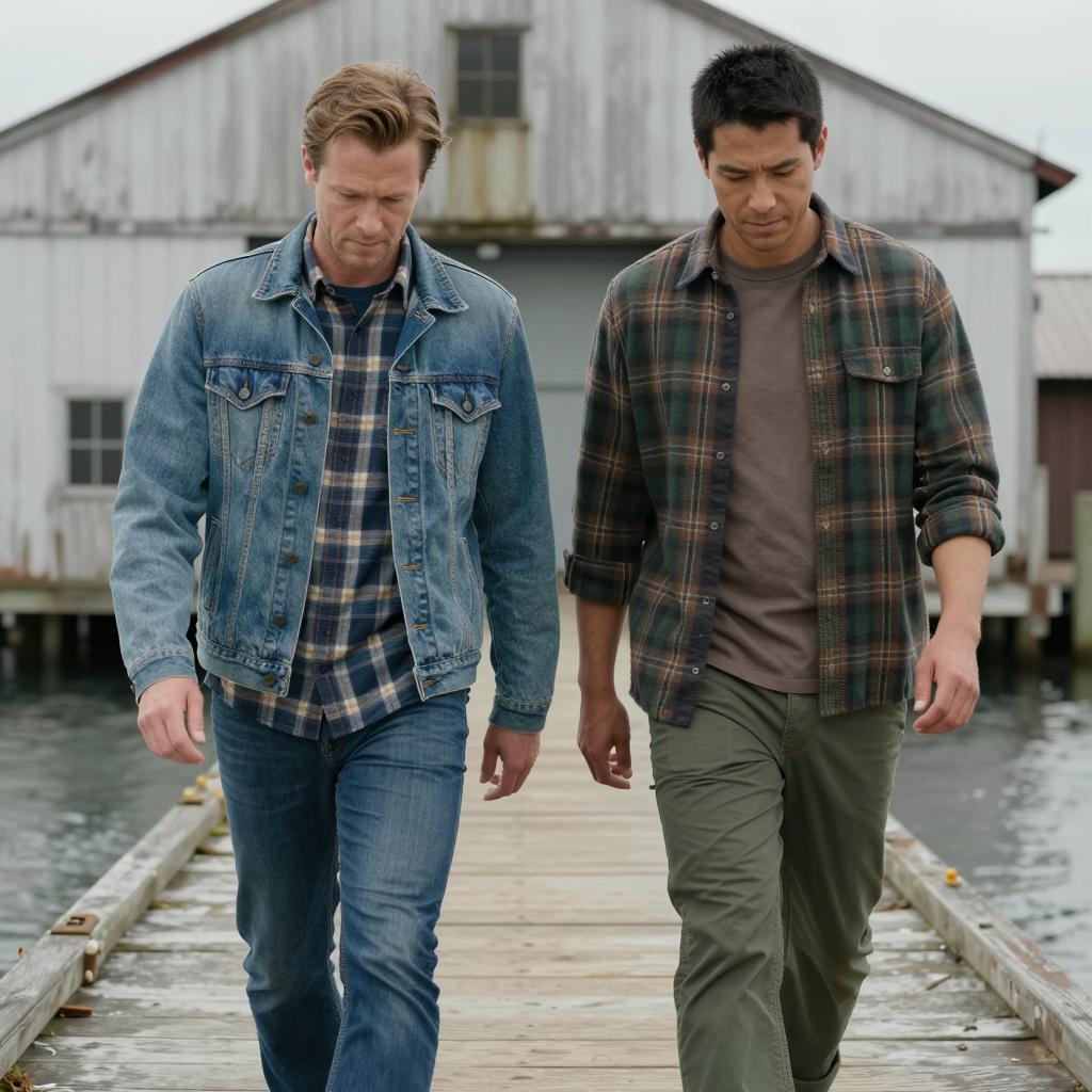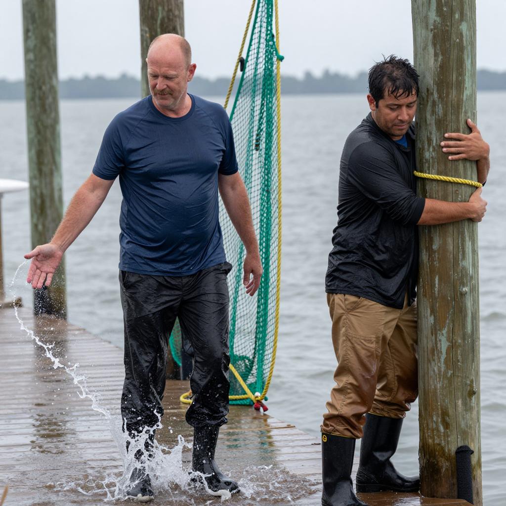 Two men in a wet, wooden dock area. The man on the left, bald with a mustache, wears a soaked blue shirt and black pants. He is splashing water. The man on the right, with dark hair, wears a black shirt and tan pants, hugs a wooden post, getting wet. Yellow rope around the post. Fishing net in the background. Water splashes prominently. Both men's expressions are focused. Two people.