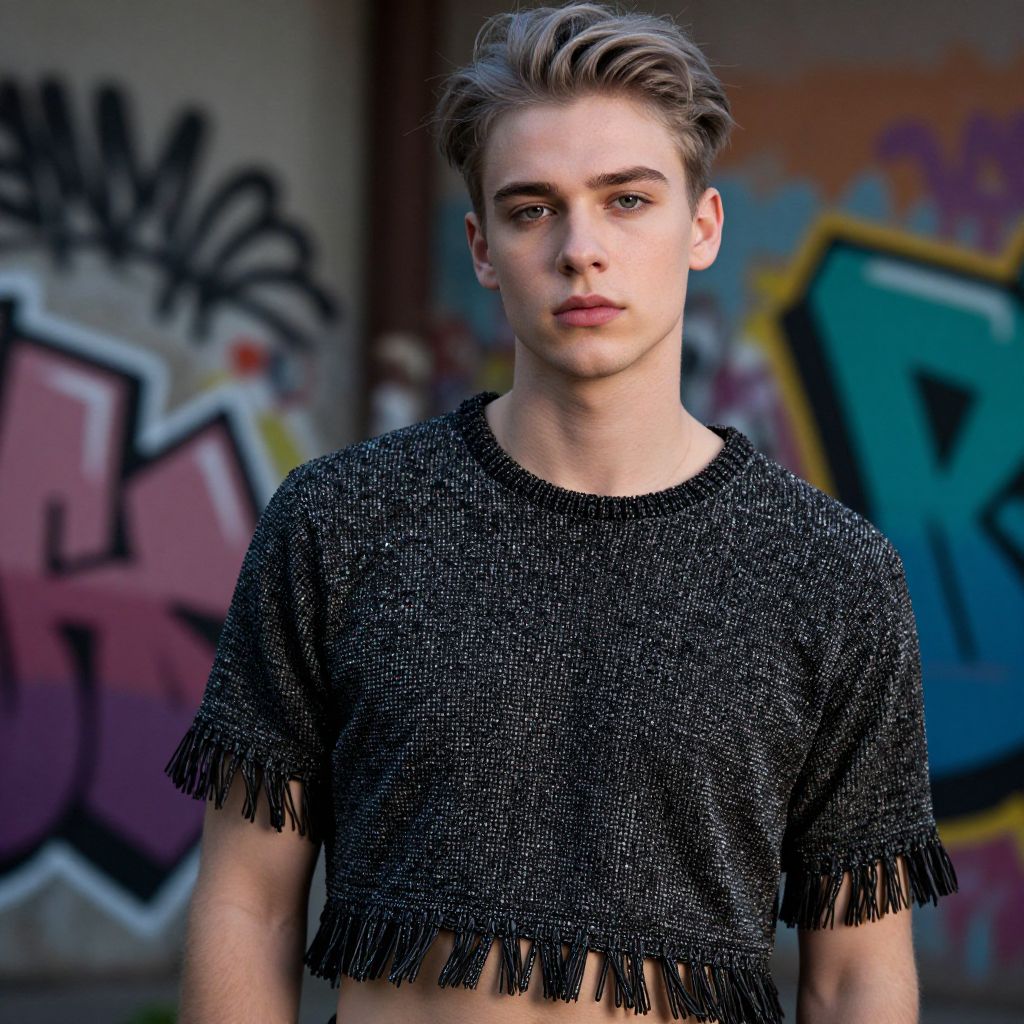 Photograph of a young, light-skinned man with short, styled blonde hair and blue eyes, standing against a graffiti-covered wall. He wears a black, short-sleeved, fringed crop top, revealing his midriff. The background features colorful graffiti with pink, blue, and yellow tags, and black spray-painted designs. The man's expression is neutral, and the lighting highlights his facial features and the texture of his top. The overall style is modern and urban.
