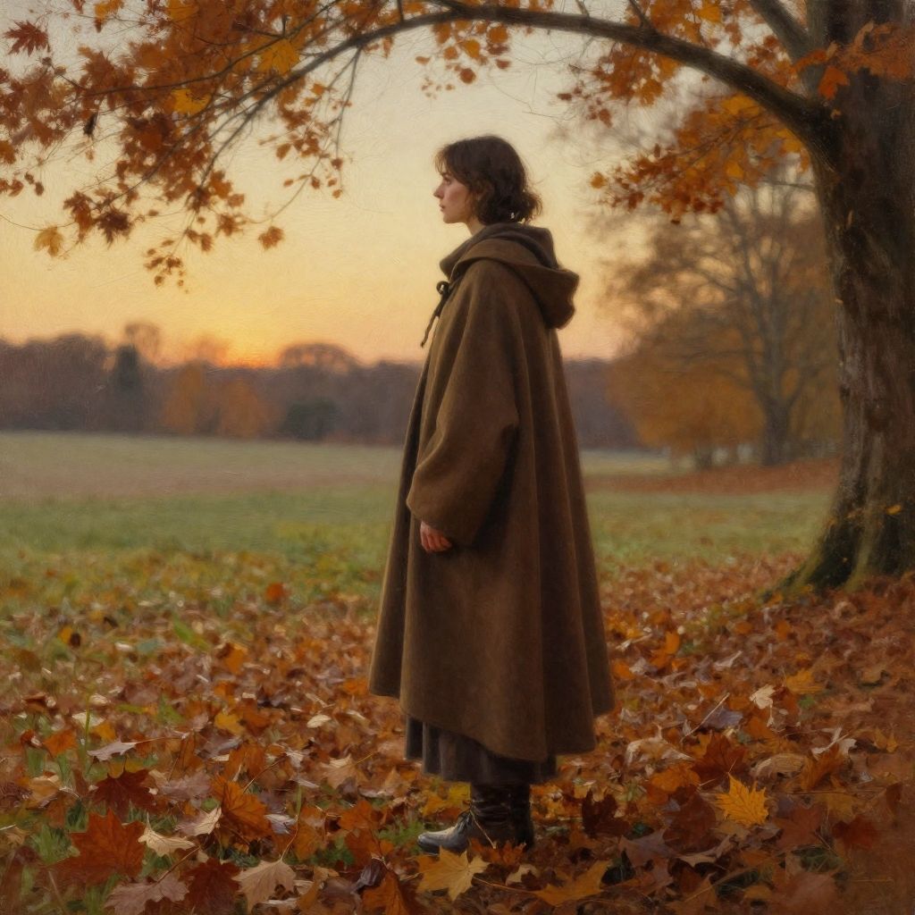 ((autumn, earthy cloak, leaves, warm brown hue, nature, quiet charm, fall foliage), sunset, warm lighting, soft shadows, golden hour, nature photography, outdoor, landscape), cinematic composition, shallow depth of field, 50mm lens, oil painting, watercolor, hyper-realistic, fine art by Duncan Fegredo and Abigail Larson