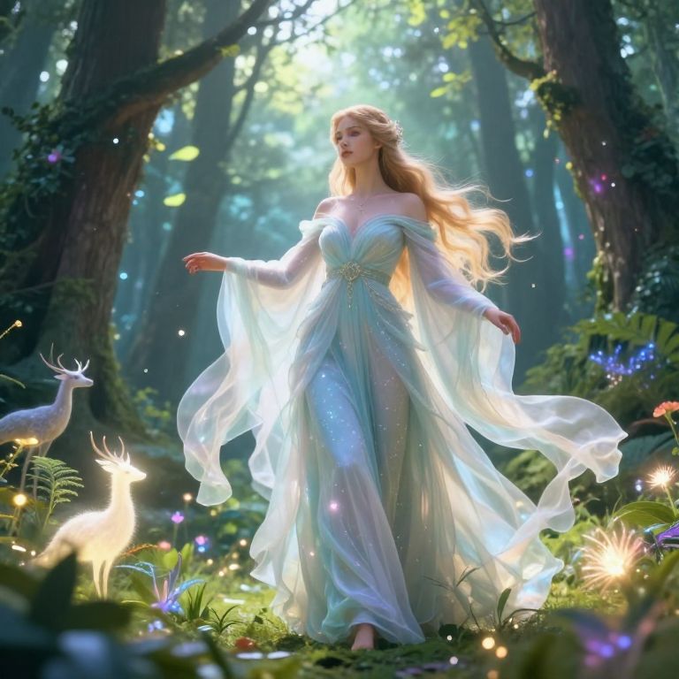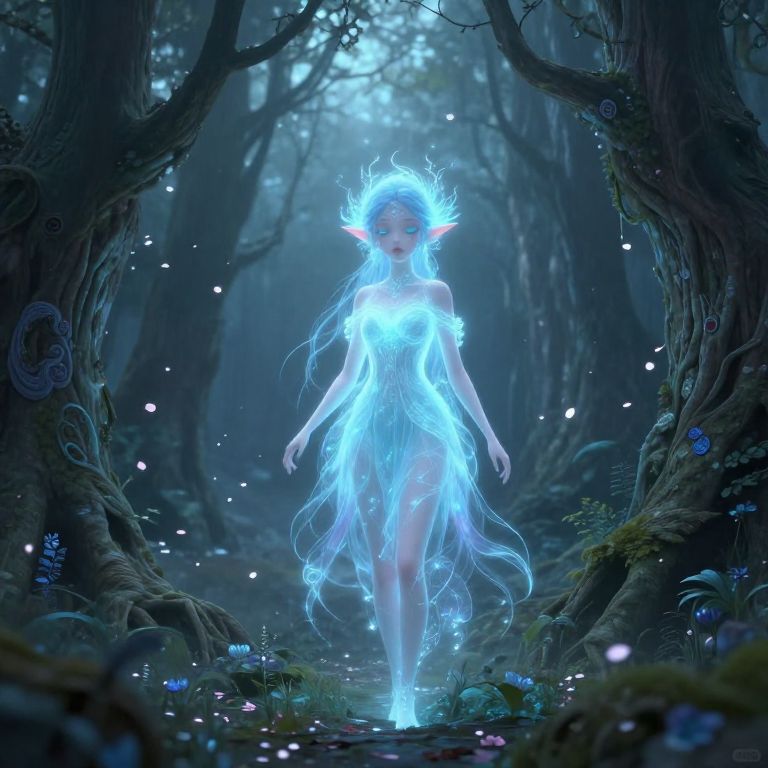 Naxida depicted as a mystical forest spirit, glowing with ethereal light, surrounded by ancient trees and floating wisps, in a dreamlike enchanted woodland setting, intricate details, vibrant colors, fantasy art style