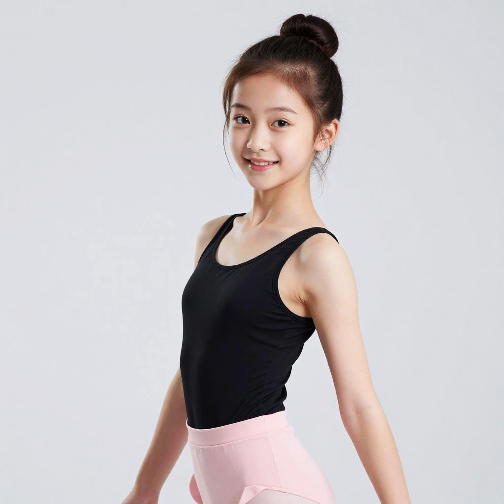Photograph of an Asian ballerina with dark hair in a bun, wearing a navy leotard and white tutu, poised in a graceful