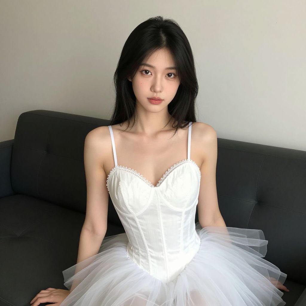 "snow ballet costume, 1girl, solo, realistic, dress, brown hair, hair bun, single hair bun Realistic photo of casual sexy person with pretty face"