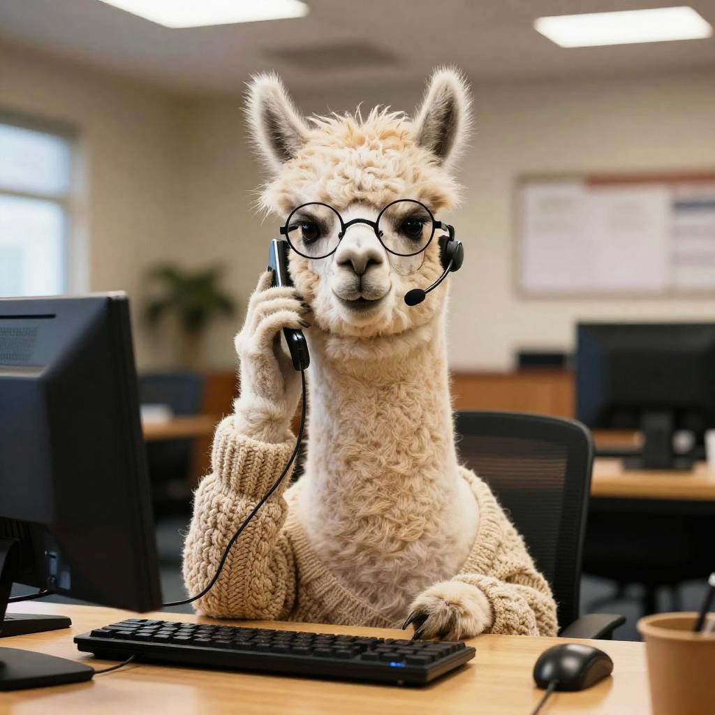 A llama wearing a knitted sweater and round glasses angrily making a phone call to tech support while sitting at a desk with a computer, captured in a deadpan and absurdly formal scene full of expressive and funny actions.