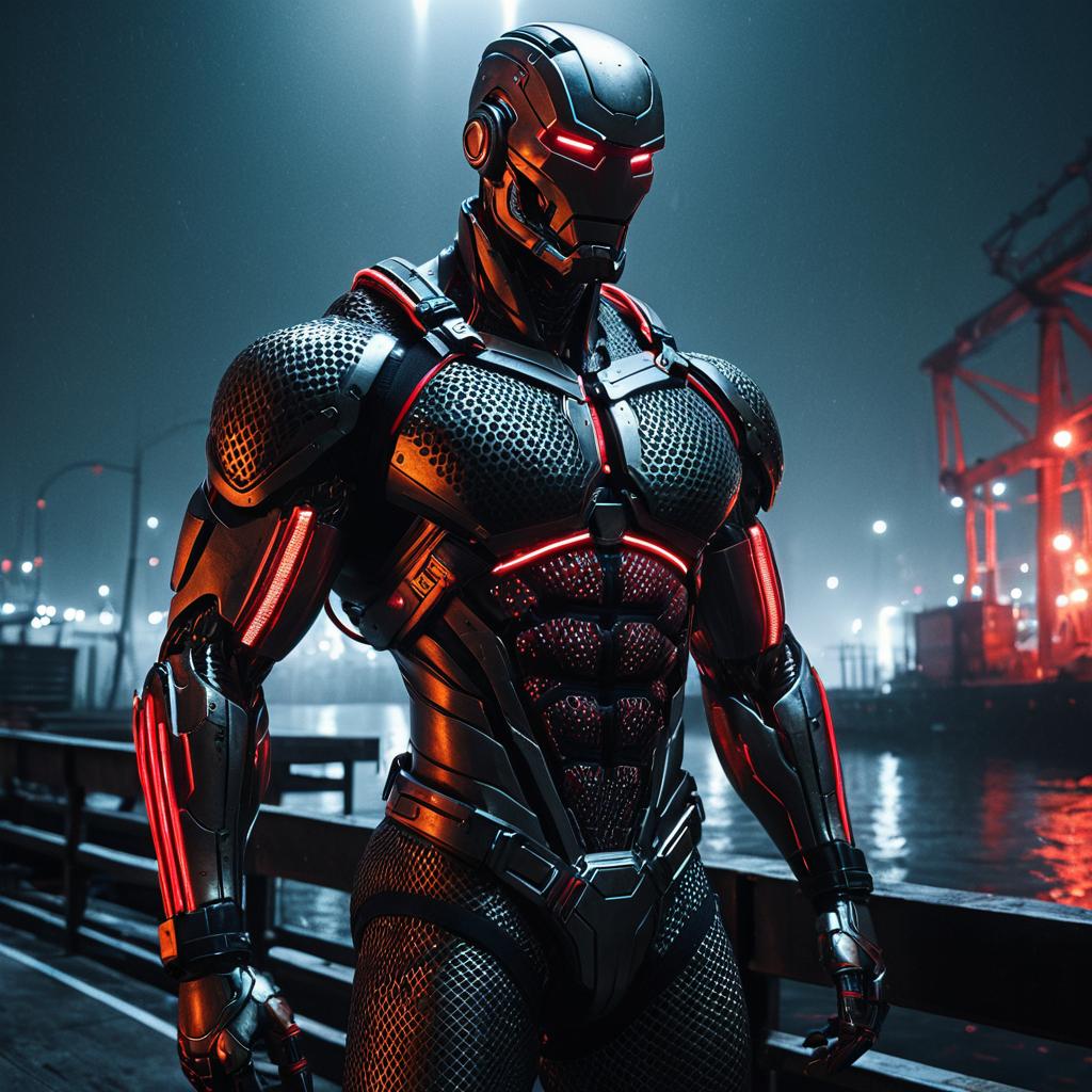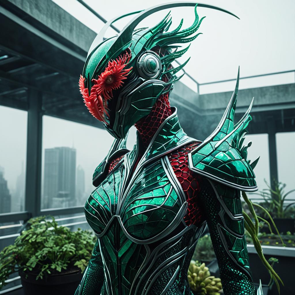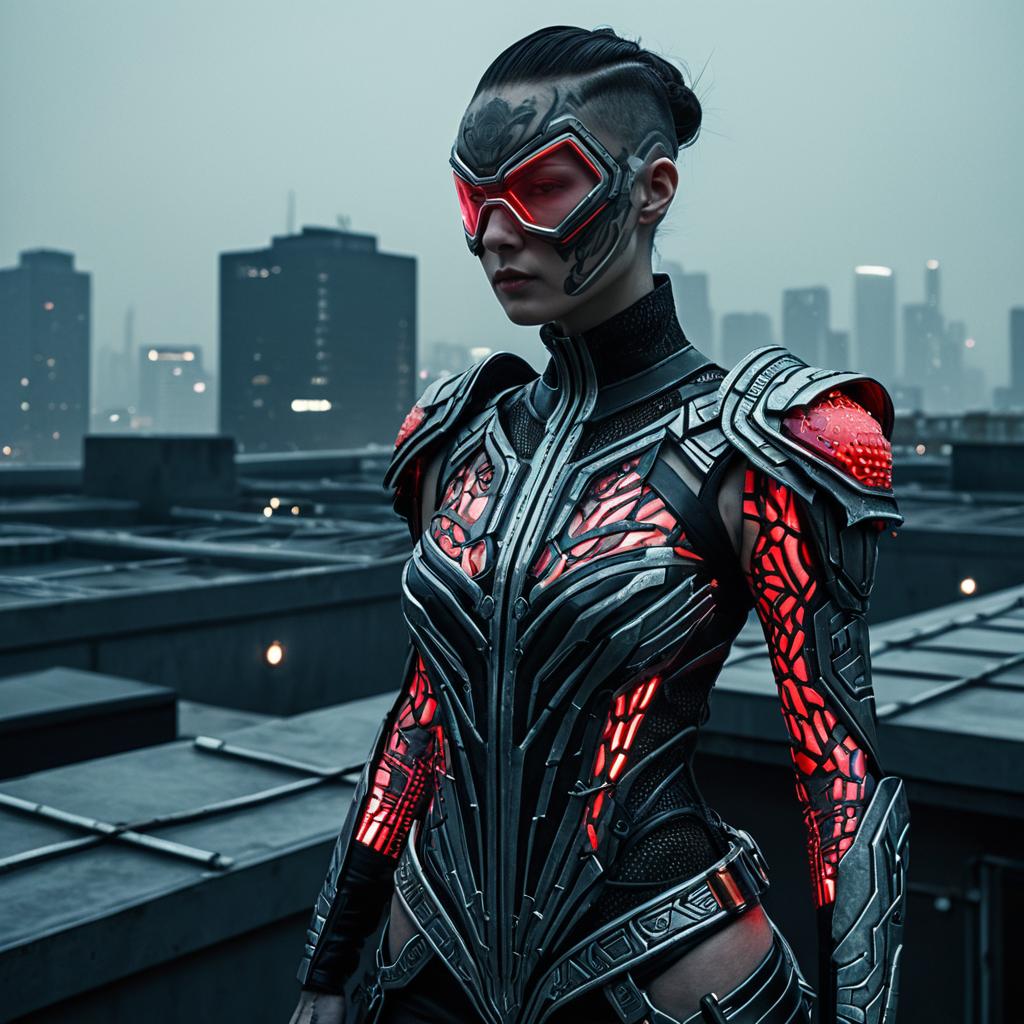 In a foggy cyberpunk rooftop garden, medium shot portrait of a charcoal tattooed late-teen desert scavenger, hyper-detailed 3D Octane render with bright three-point cinematic lighting, adorned in bare metal armor with illuminated bioluminescent veining and oxidized copper circuitry plating, raspberry chili red coral accents, sinuous root embroidery, iris van Herpen cyberpunk haute couture, ultra-sharp focus, photorealistic detail.
