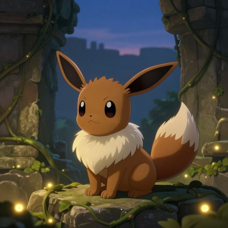 Digital art of an Eevee, a small, brown, fox-like Pokémon with large black eyes, a fluffy white neck ruff, and a bushy tail with a white tip. Eevee sits on a moss-covered rock, surrounded by glowing fairy lights and vines. The background shows ancient, crumbling stone ruins under a twilight sky, blending shades of blue and purple. Eevee's expression is curious and slightly wary. The art style is vibrant and detailed, emphasizing a magical, enchanted forest atmosphere.