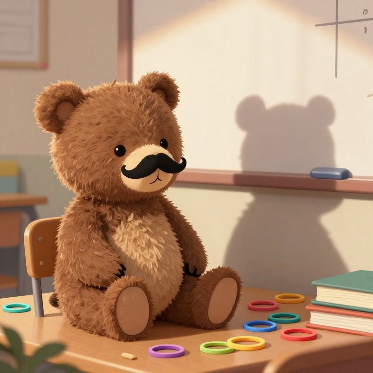 In a whimsical digital illustration, a teddy bear with a quirky mustache sits attentively in a cozy classroom setting, surrounded by colorful rubber bands, as if engaged in a playful lecture on existential philosophy delivered by its own shadow, which has mysteriously grown a mustache and taken on a life of its own.