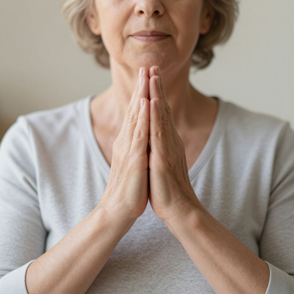A senior woman with hands in namaste prayer position, meditating