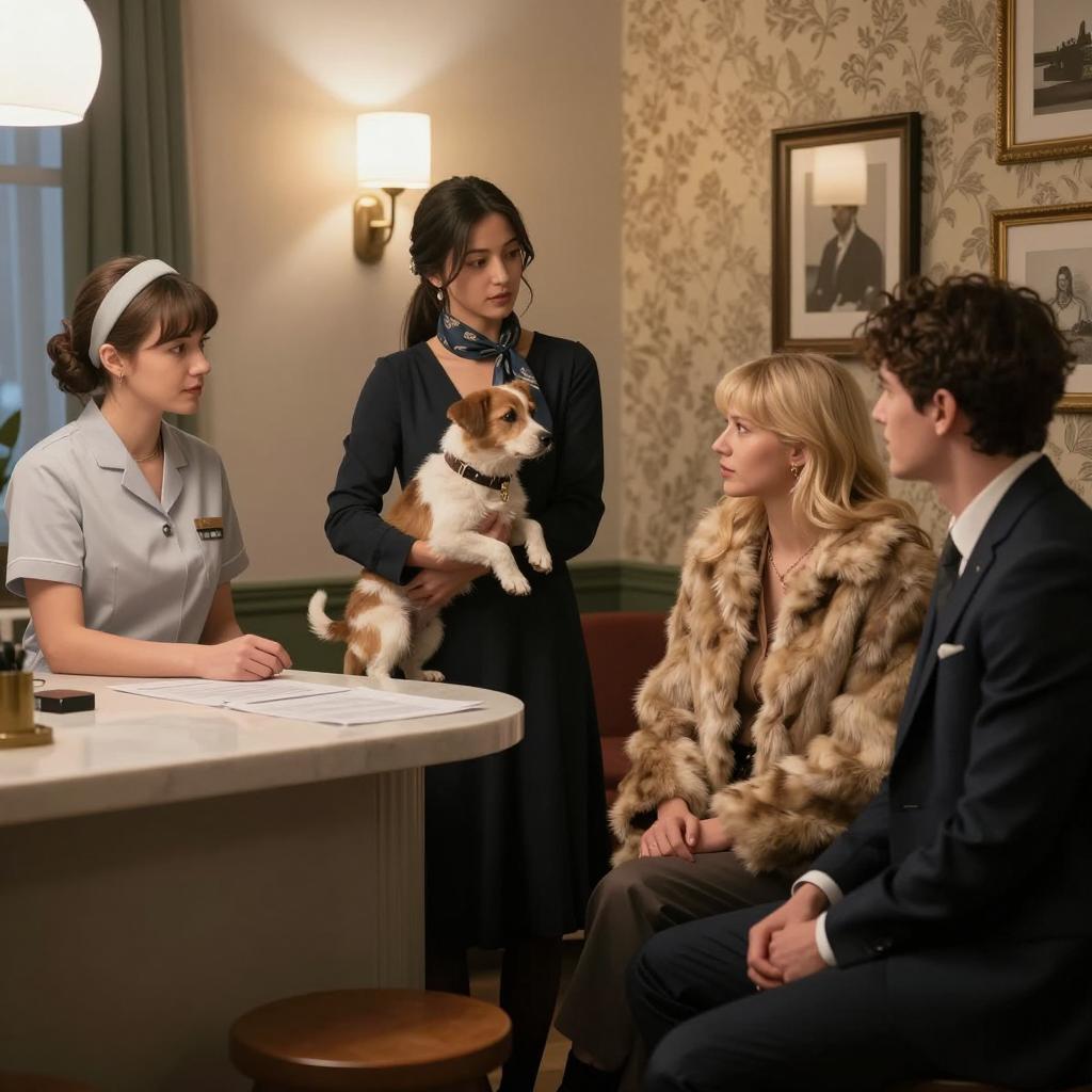 Six people in an elegant, richly decorated living room. A tall man in a dark suit holding a hat stands in the center, looking down at a seated bald man wearing a dark sweater. In the background, four men in suits and one woman in a dark patterned dress stand near a fireplace with gold-framed mirror and ornate curtains. The woman is smiling, positioned on the left side of the group.