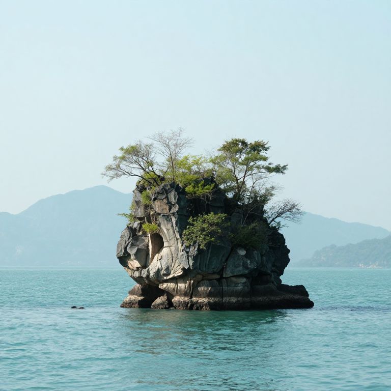 Solitary rocky islet emerges from tranquil turquoise waters, crowned with sparse greenery and delicate branches, while distant mountains frame the serene landscape under a soft, hazy sky.